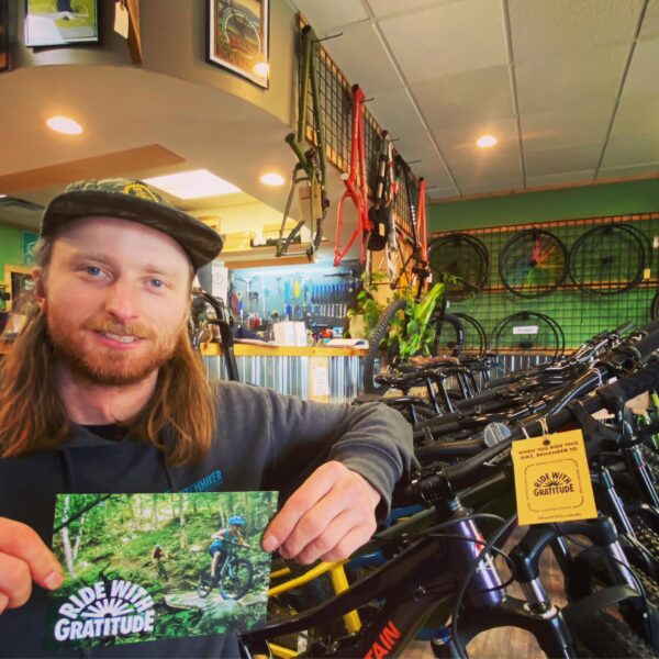 To spread the word about the Ride With Gratitude campaign, Center staff have presented at biking conferences, talked it up on podcasts, and invited retailers to participate in a hang-tag program, which will put the message, “When you ride this bike, remember to ride with gratitude,” on new mountain bikes being sold in the region. So far, five retailers have joined the program, including our newest member, Hitchhiker Bike Shop in Stowe, Vermont.